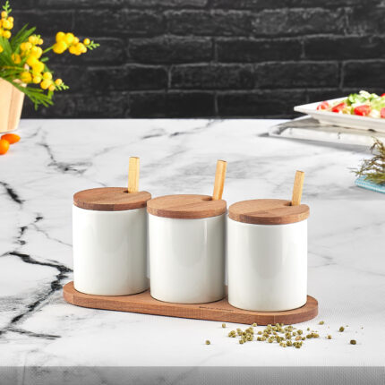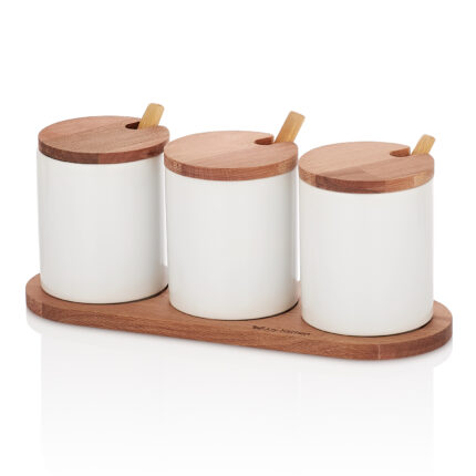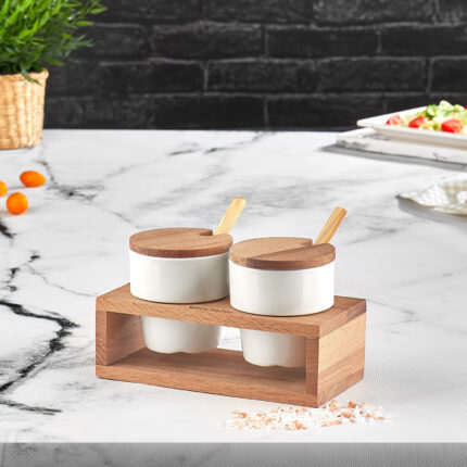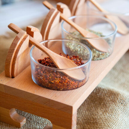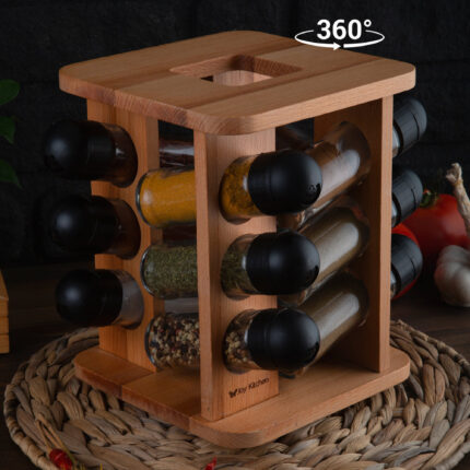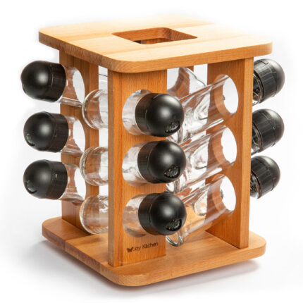 Decoratieve en roterende houten kruidenpotjes rek met bijbehorende olie -/azijn dispensers. Zeer praktisch om onder peper, zout of andere fijne kruiden in te bewaren. De inhoud van elk kruidenpotje blijft lekker vers dankzij de luchtdichte en afsluitbare deksels. Daarnaast zijn de potjes bij het wisselen van eventueel nieuwe kruiden eenvoudig te reinigen.